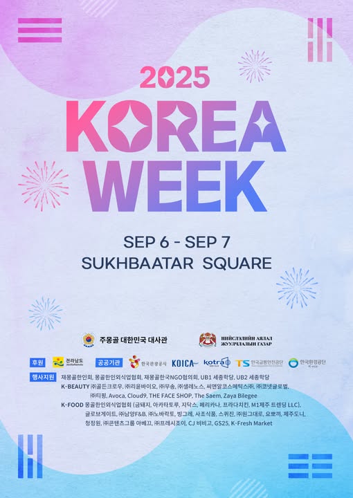 2025 KOREAWEEK “2025 Солонгосын соёлын өдрүүд” арга хэмжээ 9.6~9.7 хооронд СҮХБААТАРЫН ТАЛБАЙ дээр зохион байгуулна. K-Beauty, K-Food, K-Culture, K-POP зэрэг олон төрлийн хөтөлбөрөөр баялаг энэхүү арга хэмжээнд та бүхнийг урьж байна. Хоёр өдрийн турш Сүхбаатарын талбай дээр жижигхэн “Солонгос улс”-аар аялж, шинэ мэдрэмж, дурсамжаар дүүрэн цагийг өнгөрүүлээрэй. Солонгосын соёлыг хайрлаж, дэмждэг хүн бүхэнд нээлттэй!🎈